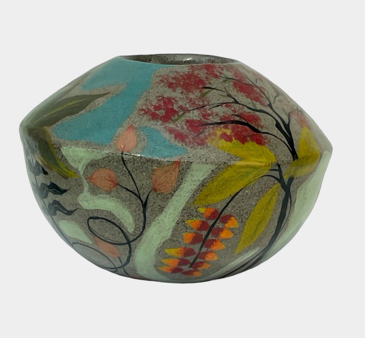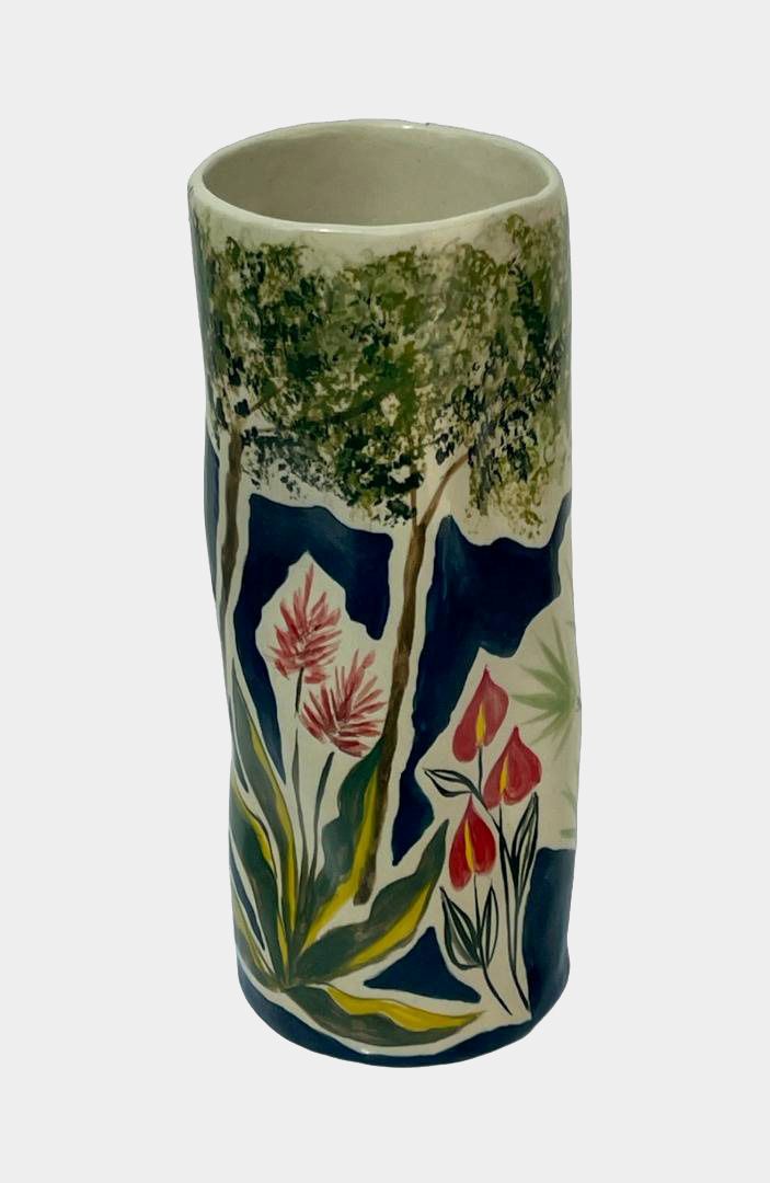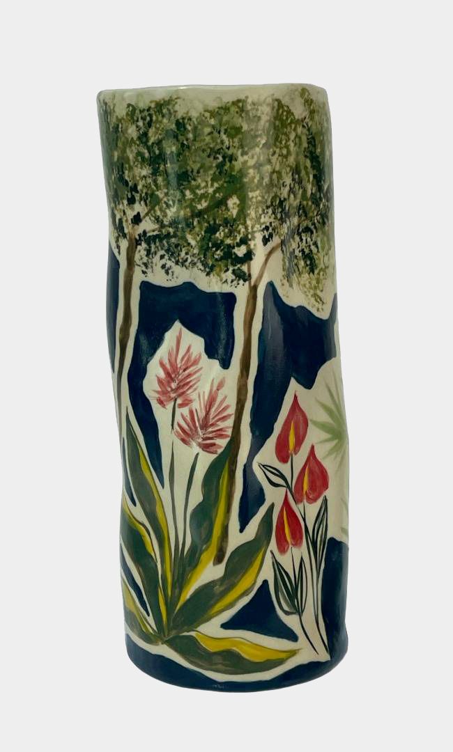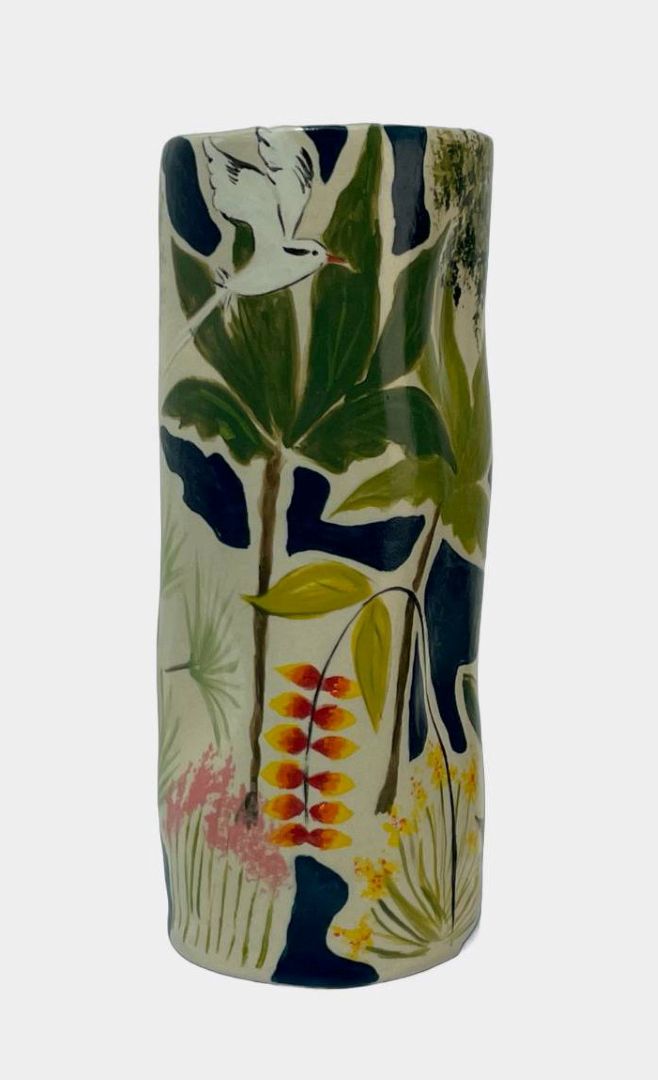 Qu’ils soient bosselés ou droits, mes vases sont en grès. On y retrouve les paysages ou montagnes de l’ile Maurice, des fleurs et arbres réel s ou imaginaires. Depuis peu, certains soliflores se parent d’oiseaux et de fleurs en relief.